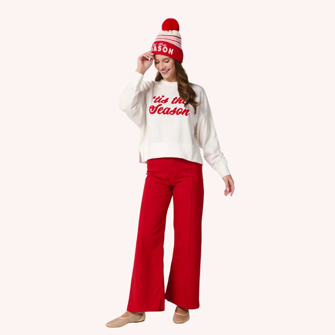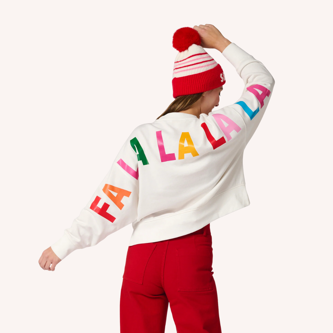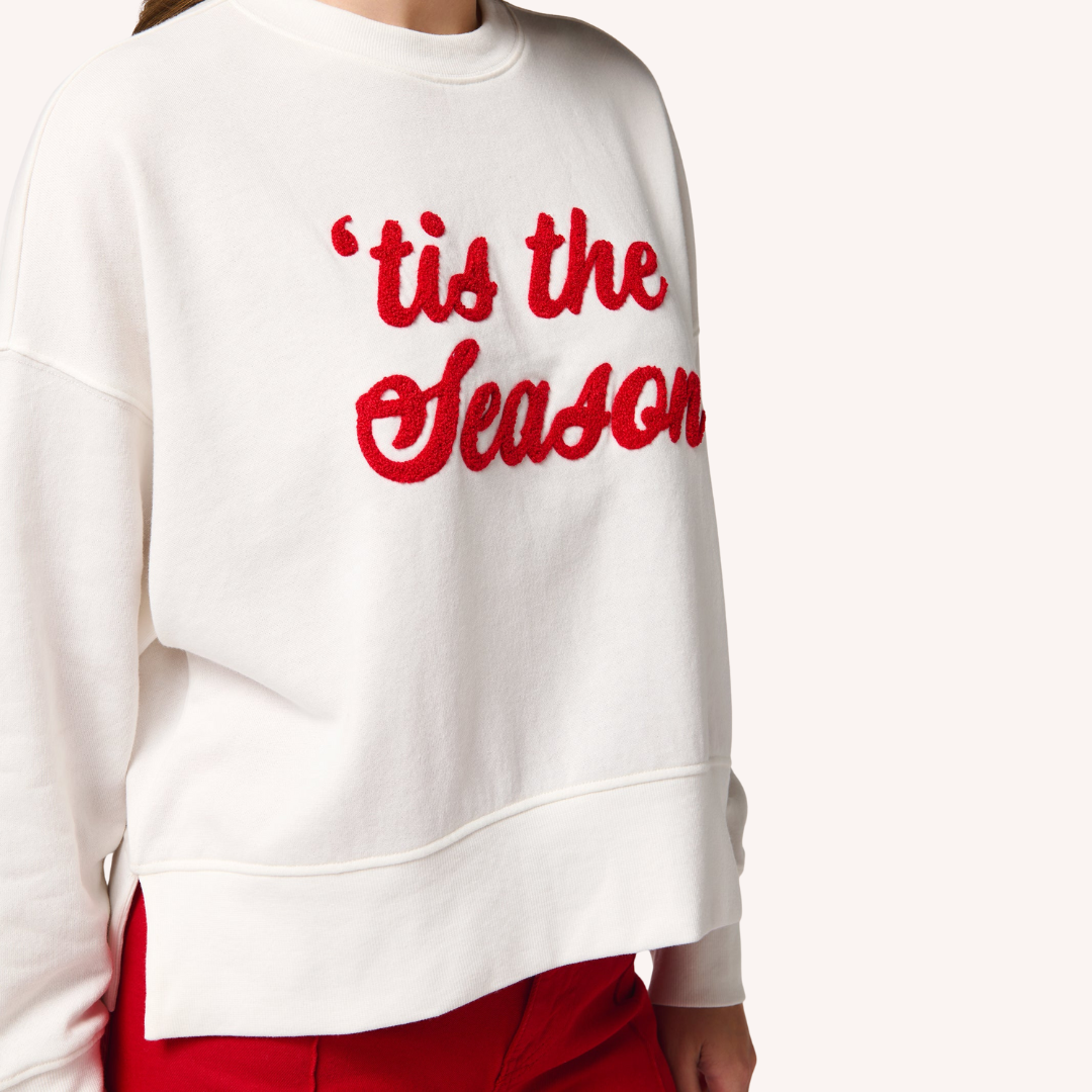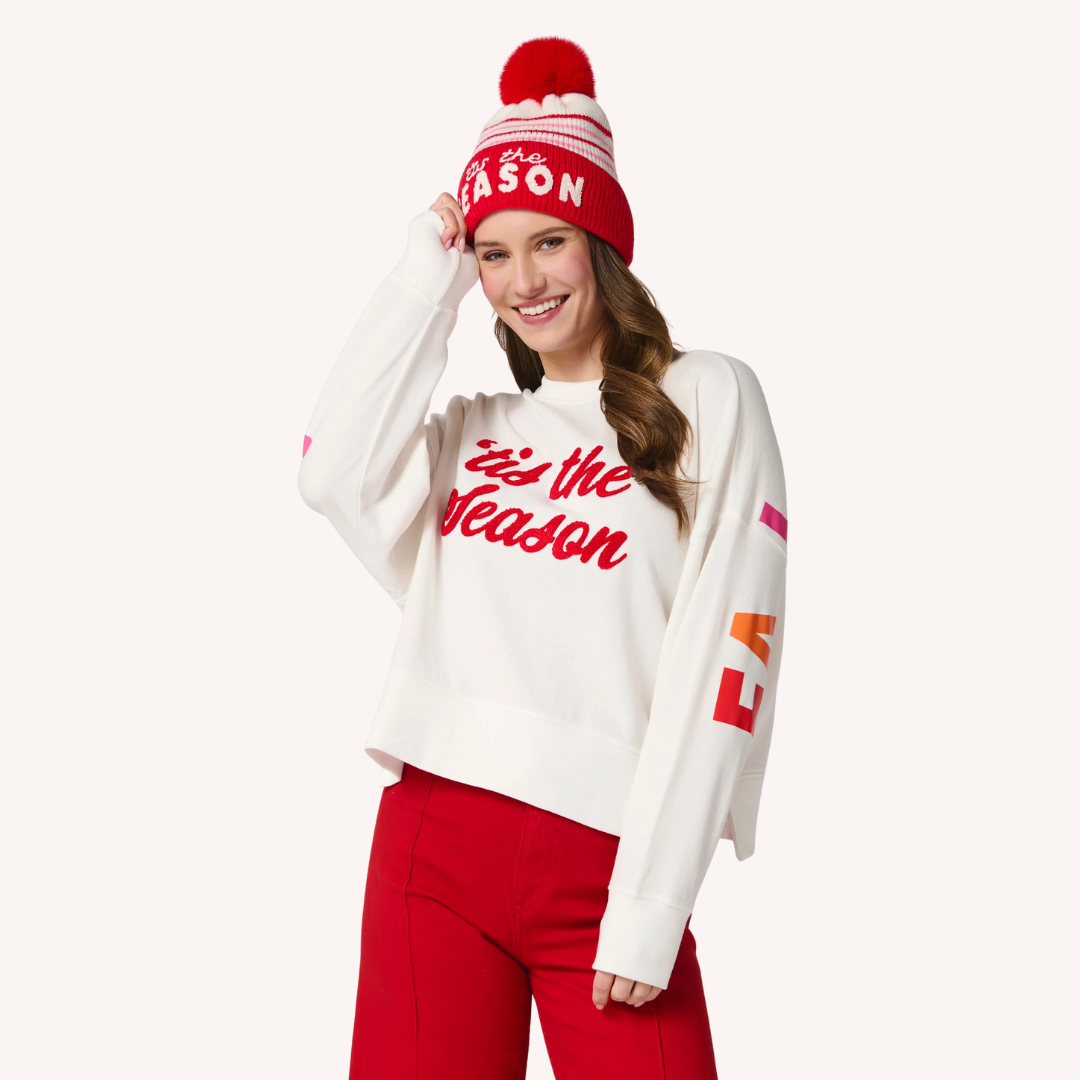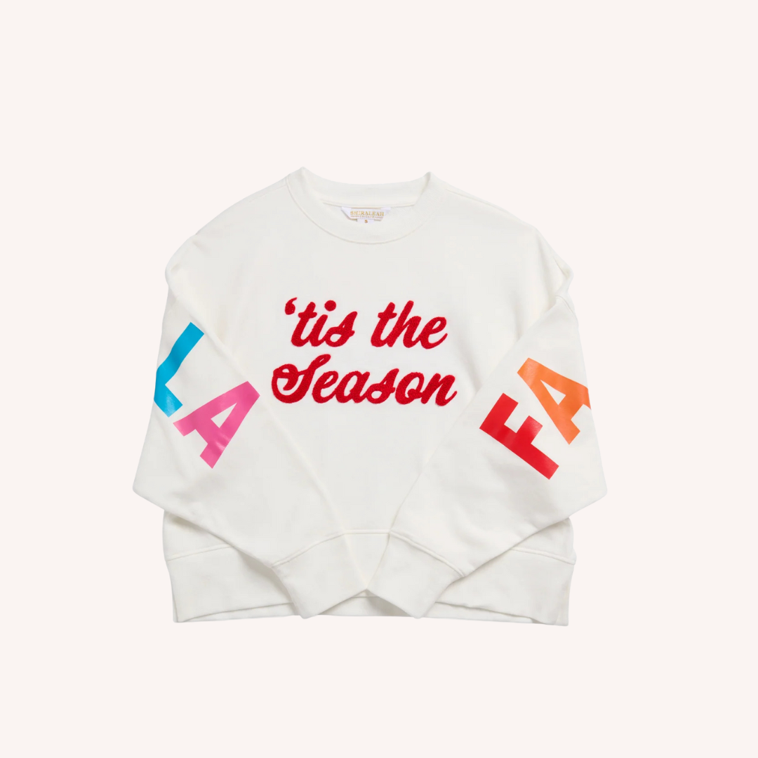 - Textured "Tis the Season" on front and multi color "Fa La La" across back and down the arms.